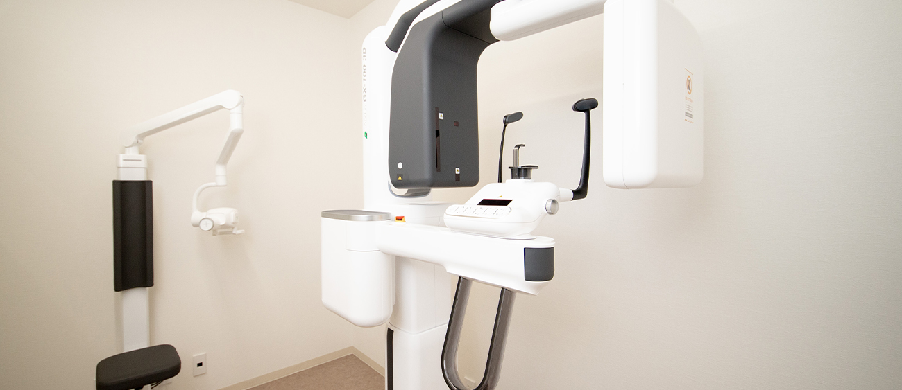 3Dの立体映像でお口周りを撮影できる検査機器です。従来の平面的なレントゲンに比べ、歯の形状や顎の骨の厚み、神経や血管の位置をより詳細に把握できます。